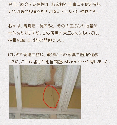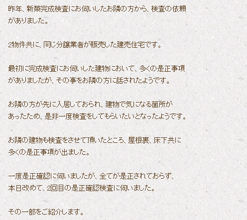 建築主が、工事途中から施工会社に不信感を抱くようになり、当事務所が検査することに